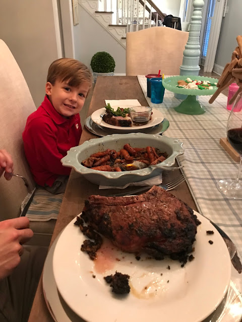 One thing I really like about Panthers game is that they are only 10 min from our house and not 2.5 hours like NC State games! Only downside is the fans have a tendency to be more passionate than college fans. We had to earmuff the kids several times from the guy behind us.We then went home and quickly changed before heading to the Toms Annual Christmas Eve party.